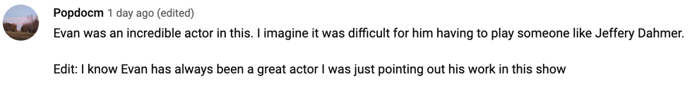 In a cast interview—"Making DAHMER: A conversation with the cast and Ryan Murphy" posted to YouTube by Netflix—Peters talked about the difficulty of playing such a dark role as well as the need to "get back into the light."
