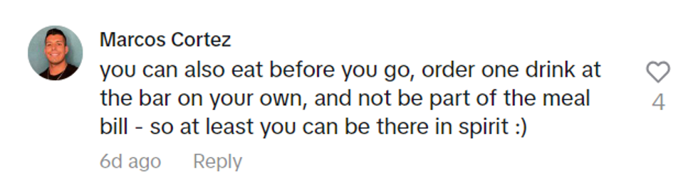 Because the evening was so expensive, Lans decided that he would skip the dinner entirely and join the group for the event after— that way he'd be in a better headspace from not stressing about what he spent, and he'd be able to better celebrate his friend's birthday.