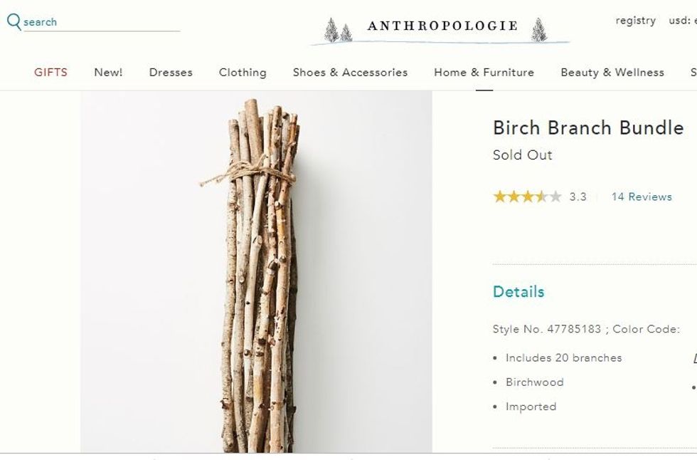 The product is called "Birch Branch Bundle" and Twitter is losing its collective mind that a store would sell a bunch of sticks one could go pick up outside.