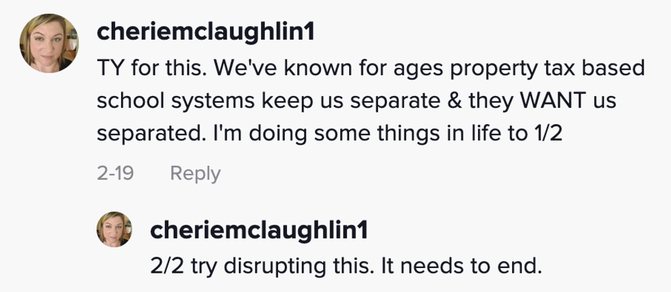 Her clip was captioned with the hashtags: #carmelhighschook #propertytax #schoolfunding #equalfunding.