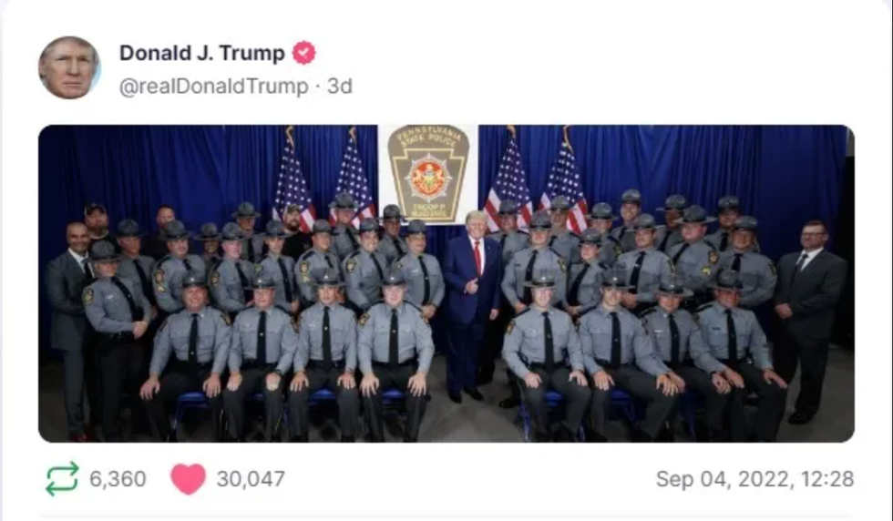 \u201chttps://t.co/ywjJUX01qn say the Pennsylvania State police did not authorize this and are not on one side or the other but this picture says otherwise! These are people they want to get rid of the FBI and police and military unless they\u2019re on their side! Remember that in November!\u201d— Trisha Francis (@Trisha Francis) 1662738853