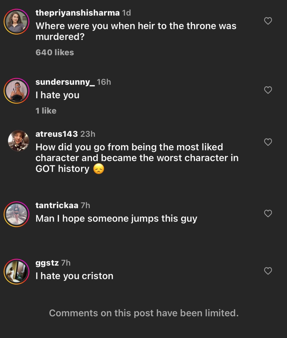 The 30-year-old British actor was forced to limit engagement on his social media pages after so-called fans left toxic messages and threats aimed at his knight character that many consider to be one of the "worst" in the Game of Thrones universe.