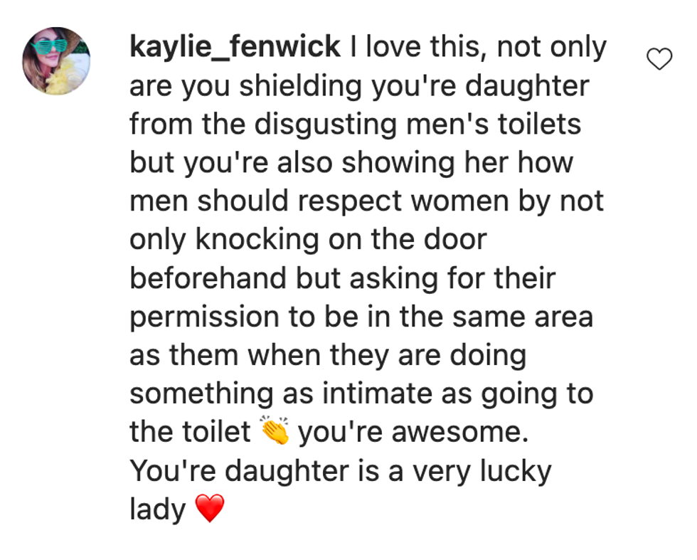"Usually we would go places and they have FAMILY bathroom which are meant for people with children but what I found was most places don't have them and Dads are left to decide between taking their daughters to the men's bathroom or the women's."