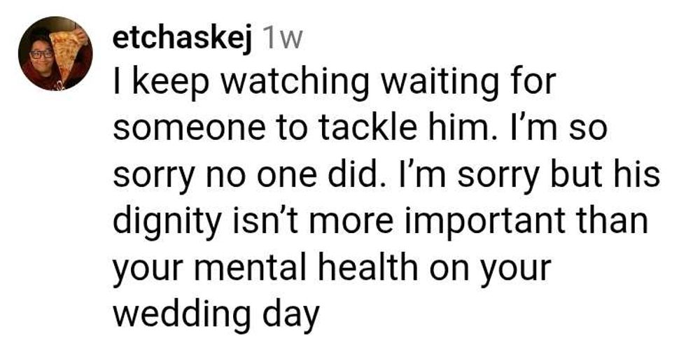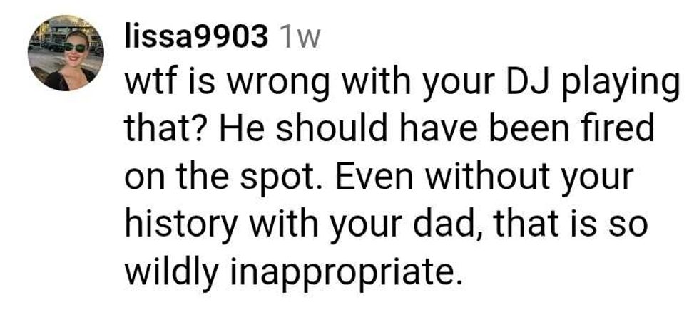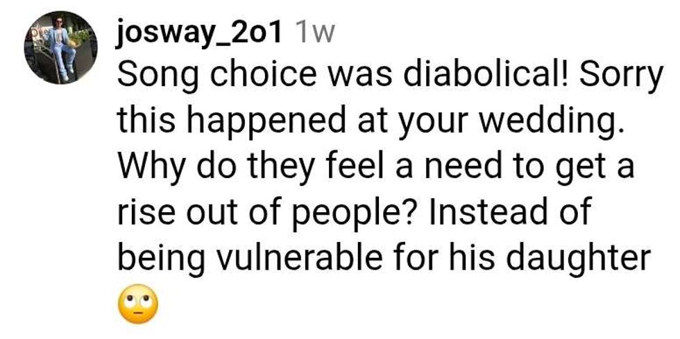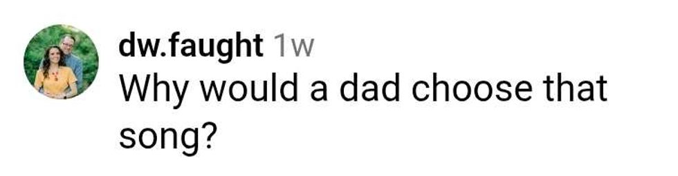 Raspor replied with a video of her dad thanking the DJ, then saying he had music queued up and he'd take requests, followed by "I'll Make Love To You" playing as dad grinned then looked toward the bride.