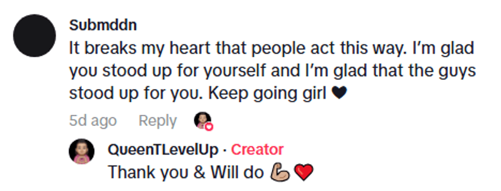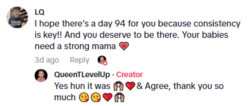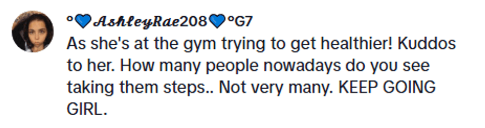 The woman is TikToker @QueenTLevelUp, and she started her health journey a while ago. The day the man criticized her was her 93rd consecutive day going to the gym.