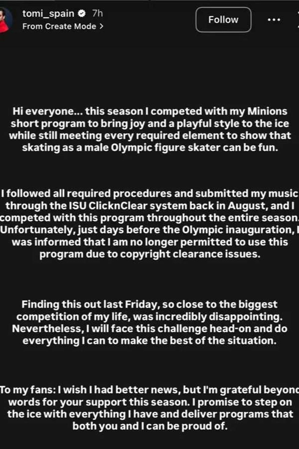 The Catalan skater had used the music throughout the season without issue after purchasing the required permissions under International Skating Union (ISU) regulations. Thanks to its playful originality, the routine had become one of the most anticipated men’s short programs heading into Milan-Cortina.