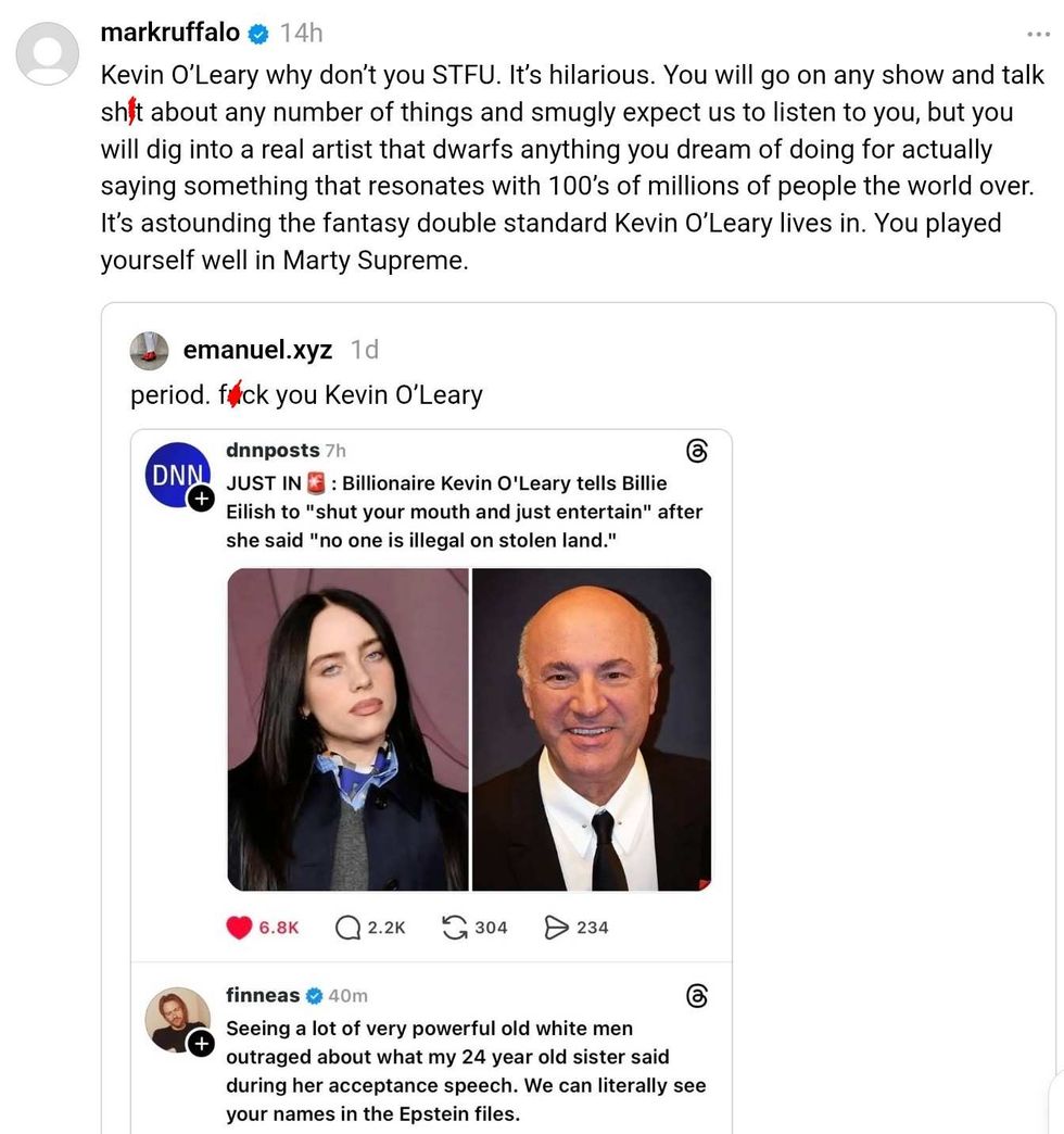 Ruffalo reposted O'Leary's comment with Finneas' Threads post, then added: