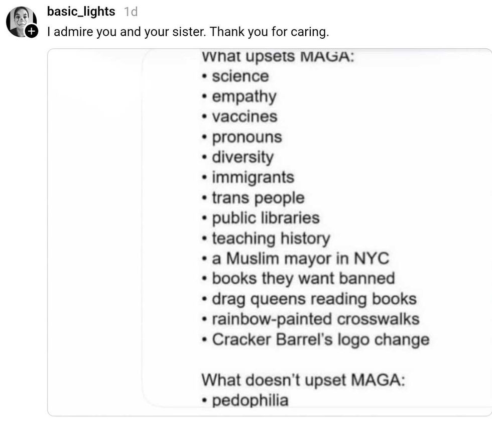 "Seeing a lot of very powerful old white men outraged about what my 24 year old sister said during her acceptance speech. We can literally see your names in the Epstein files."