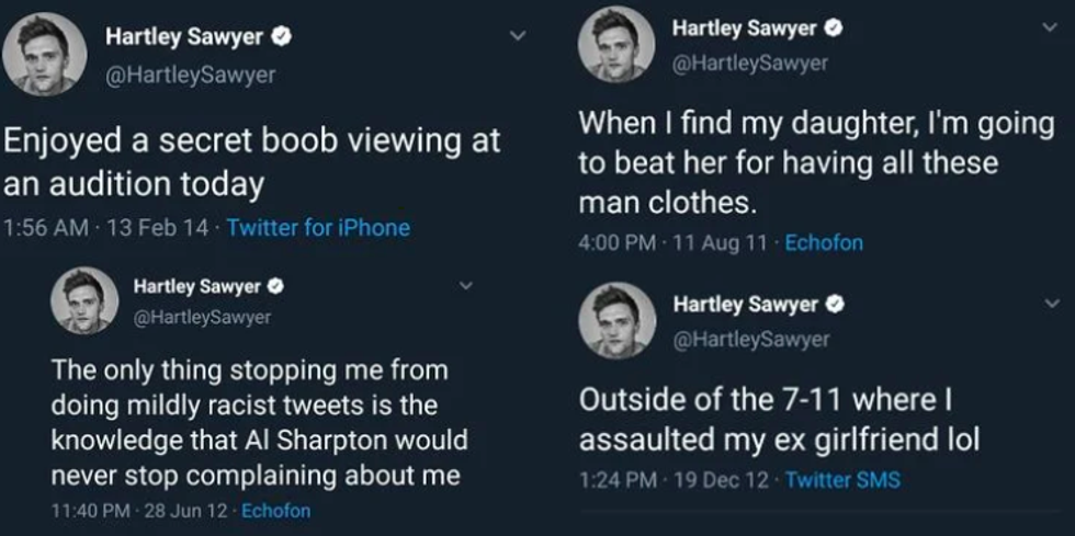 Content Warning: Sawyer's tweets contain references to violence against women, racism and child abuse