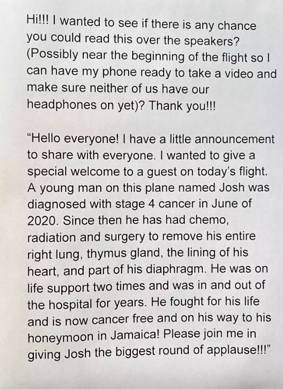 "A young man on this plane named Josh was diagnosed with stage four cancer in June of 2020. Since then he has had chemo, radiation, and surgery to remove his entire right lung, thymus gland, the lining of his heart, and part of his diaphragm."