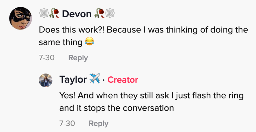 "Yes! And when they still ask I just flash the ring and it stops the conversation."