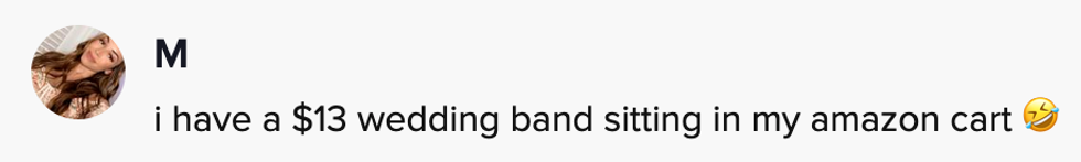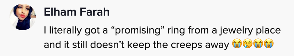 In a superimposed text, she said the prop was a "fake Amazon engagement ring at work to keep the creeps away."