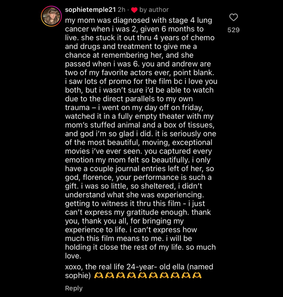 "You captured every emotion my mom felt so beautifully. I only have a couple journal entries left of her, so god, Florence, your performance is such a gift."