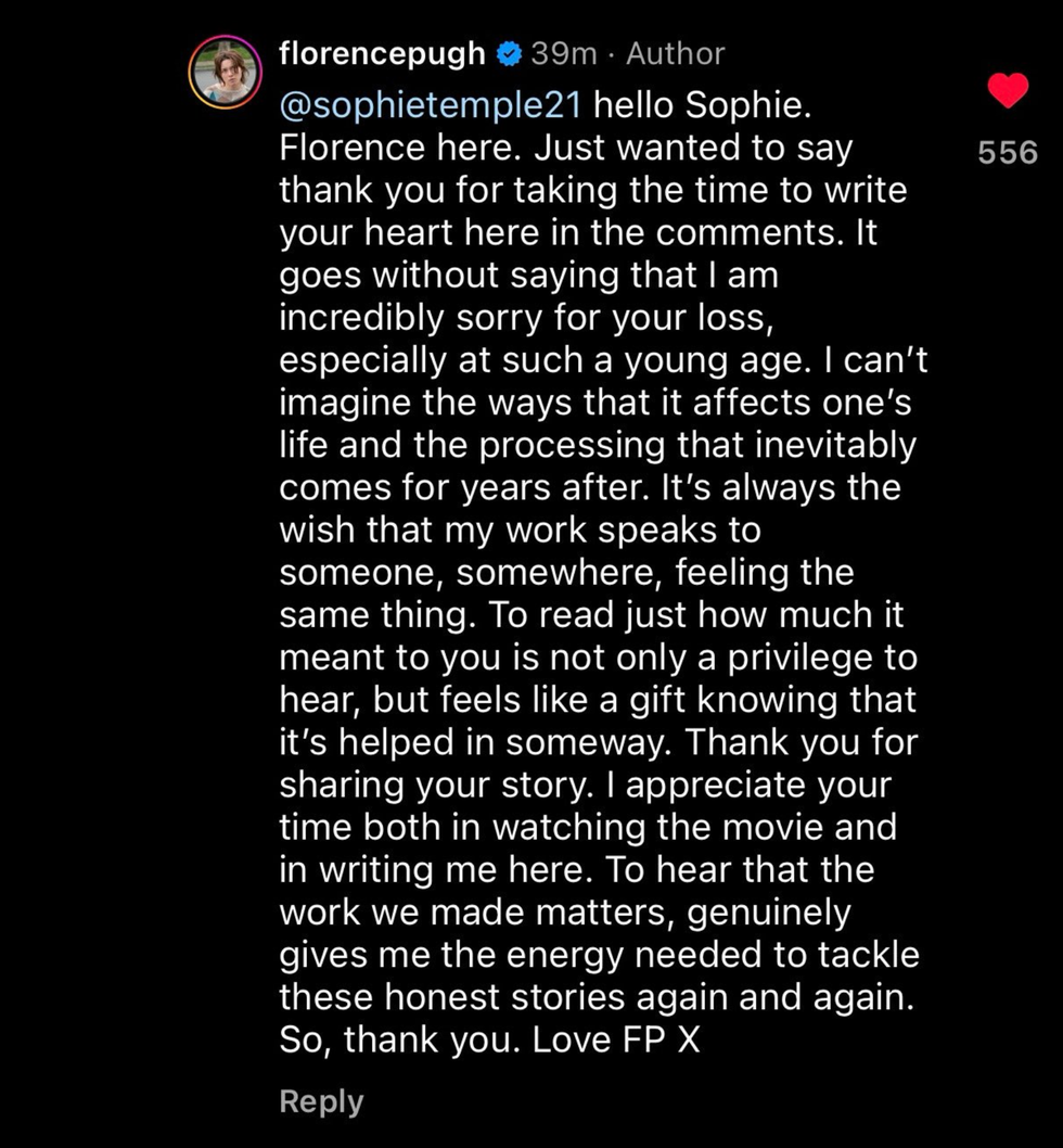 A fan named Sophie, who related to the film, was compelled to reach out to Pugh in a lengthy message expressing gratitude for Pugh's performance.