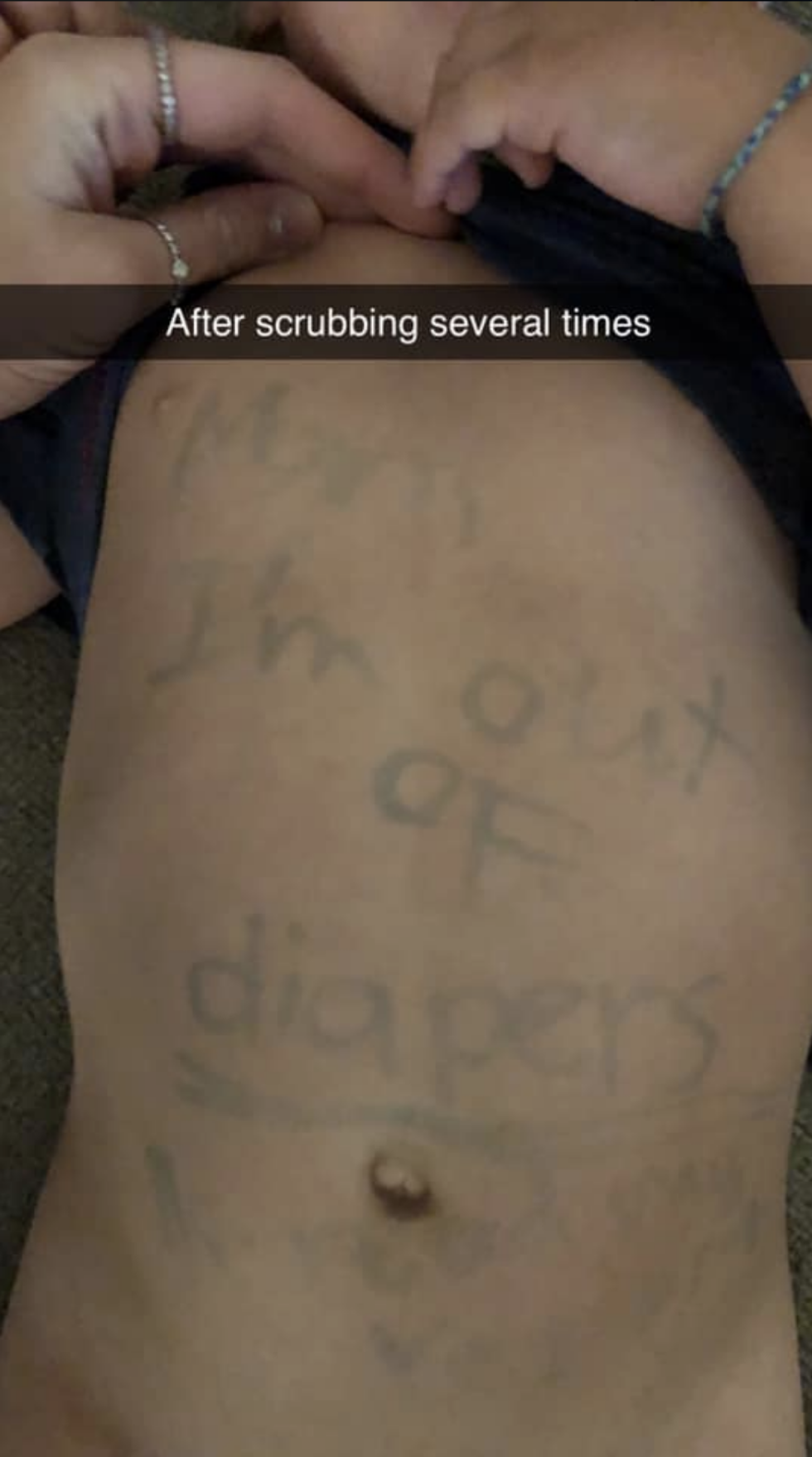 "You can't even see all of it in the pic.. it says, 'Mom I'm out of diapers pls read my report'. I've scrubbed it with several baby wipes and it's not coming off."