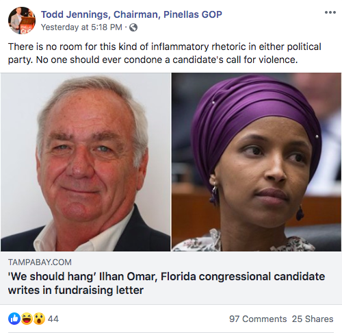 However after the Tampa Bay Times shared the story, Pinellas County GOP chairman Todd Jennings shared the article on Facebook and wrote: