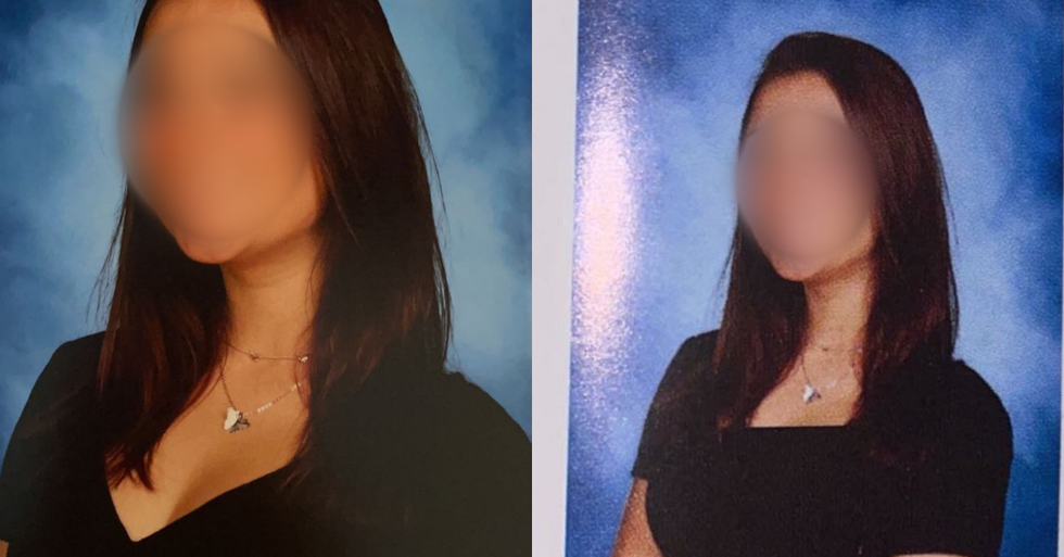 One student, Riley O'Keefe, had a visible black bar copy-pasted over her chest where a small amount of cleavage was visible.