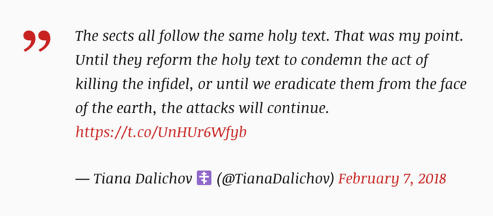 Volitich's podcast, however, is not the only outlet she uses to spread her racially charged, alt-right philosophies. Her Twitter account, @TianaDalichov, has since been suspended, for the second time. "Dayanna Volitich suggests Muslims be eradicated from the earth, believes anti-Semitic conspiracy theories ... and teaches middle school social studies," HuffPost reported on Saturday.