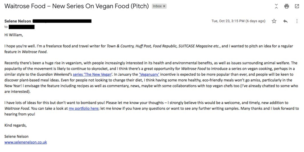 This is Nelson's original email, with the pitch to Waitrose Food Magazine: