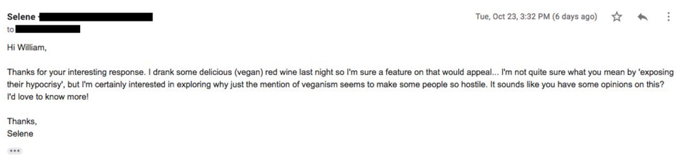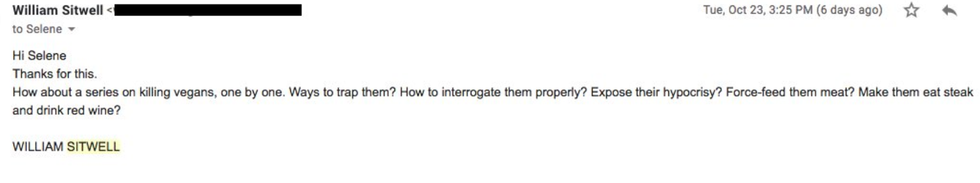 The editor is named William Sitwell and the joke that caused controversy was about “killing vegans.” He made this joke in response to a vegan freelance journalist pitching work to the magazine.