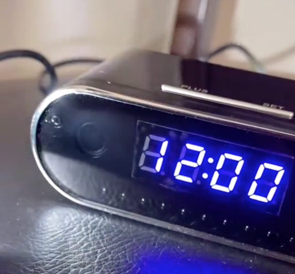"This alarm clock is mirrored but if we shine a bright light at it, we can see through the glass and see there is a camera there."