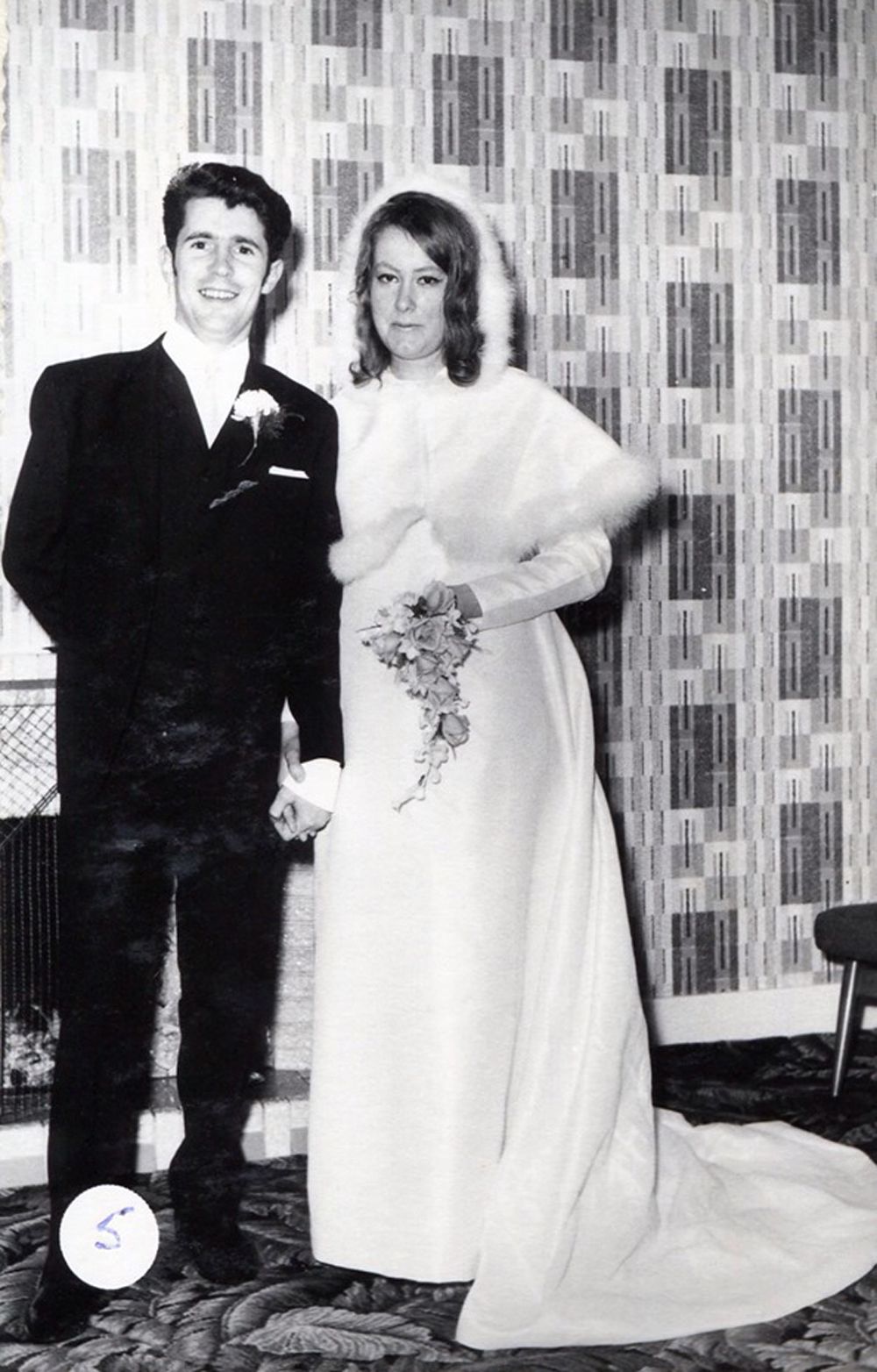 After meeting Ronnie when she was 22 at a party which she claims he gatecrashed, Carine married him at Twynholm Parish Church, Kirkcudbright, on 31 October 1970, wearing the dress, which bought in a shop called the Wedding Bells in Glasgow, while he wore a suit.