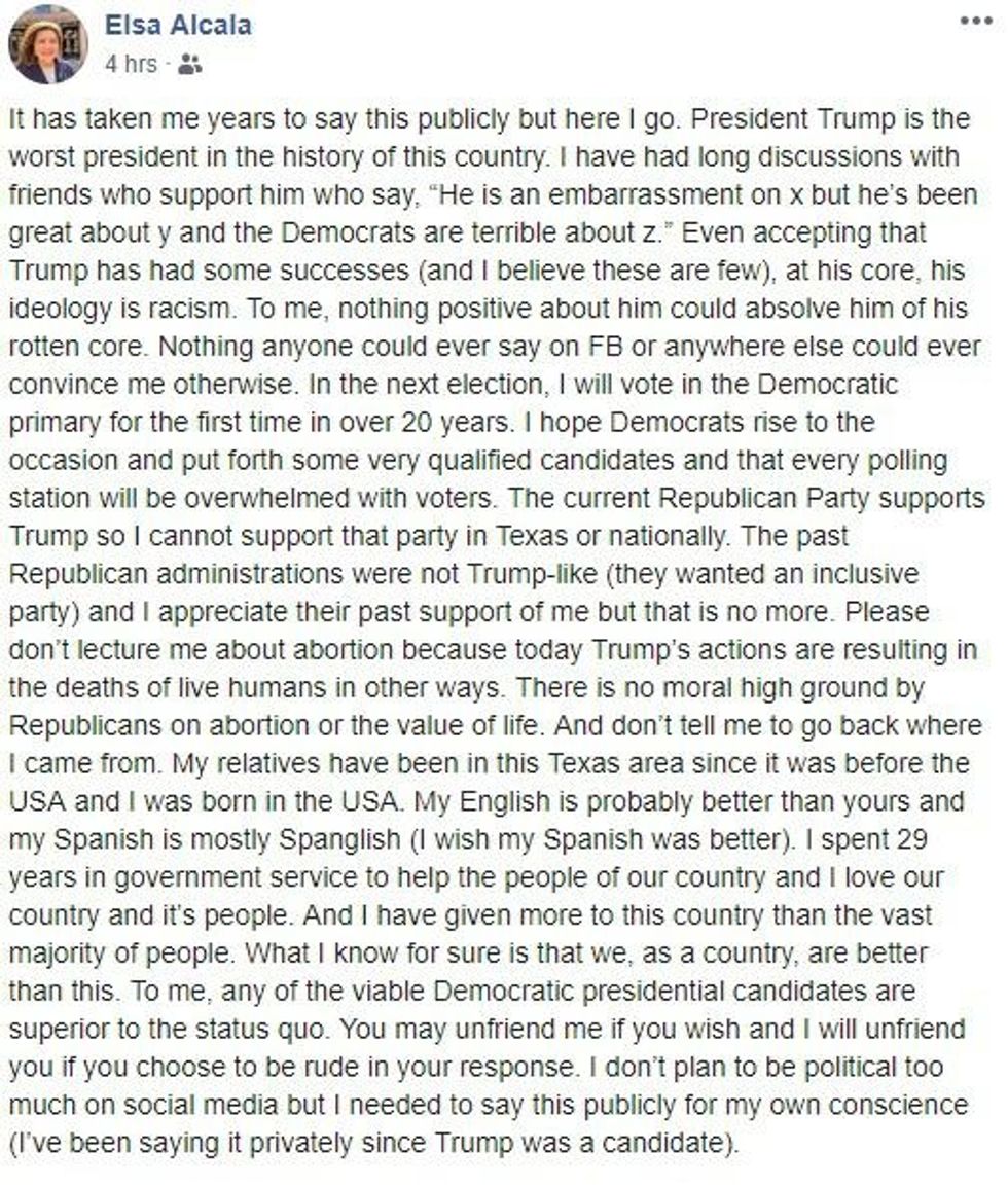 But many others, including Elsa Alcala, a former Republican Judge on the Texas Court of Criminal Appeals, can no longer stand idly by.