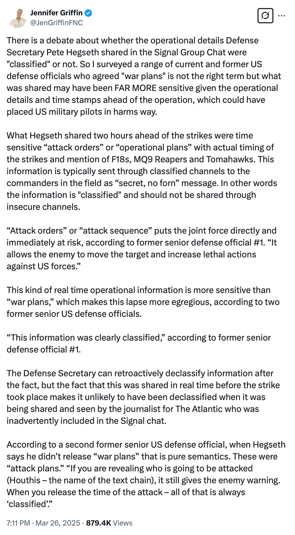 "What Hegseth shared two hours ahead of the strikes were time sensitive 'attack orders' or 'operational plans' with actual timing of the strikes and mention of F18s, MQ9 Reapers and Tomahawks."