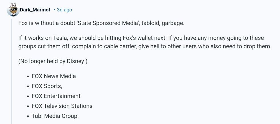 Others suggested it was time for Fox News to take a financial dive like Tesla.