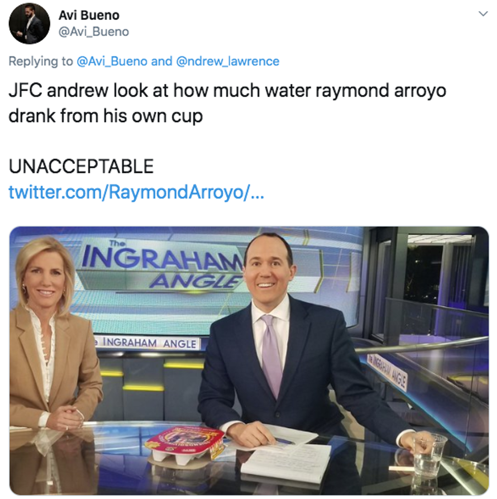 "He drank a lot of water, Laura," a concerned Raymond Arroyo told host Laura Ingraham.