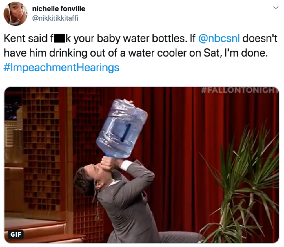 George Kent, the Deputy Assistant Secretary of State for European and Eurasian Affairs who gave testimony alongside top Ukraine diplomat Bill Taylor, made a point of staying very hydrated during the long proceedings.