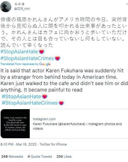 Today, @KarenFukuhara was attacked, getting hit in the head at random. This shit needs to stop NOW! When is this going to stop?! I'm fearful for my life and more than my own, the life of my mother. This injustice and racism cannot go unpunished. This MUST stop NOW! #StopAsianHate— Yoko Higuchi (@Yoko Higuchi) 1647477218