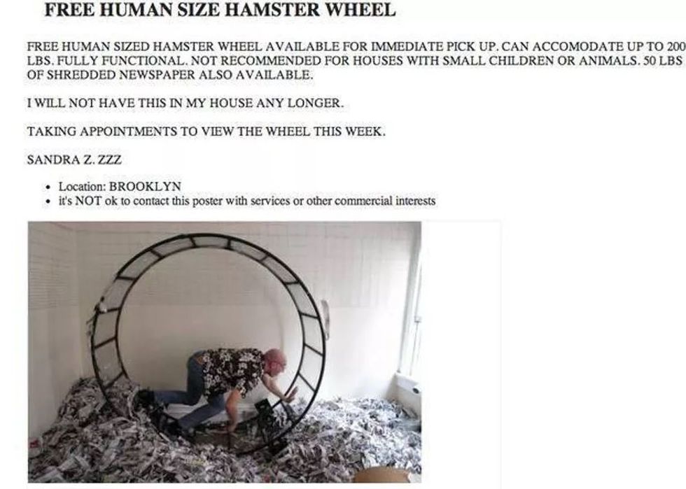 So, some people may look at this ad and think “Who would want a human-sized hamster wheel?” which completely bypasses the most important question. Who would make a human-sized hamster wheel? What exactly is going on in Sandra Z’s Brooklyn abode that the giant wheel and 50 lbs of shredded newspaper were necessary?