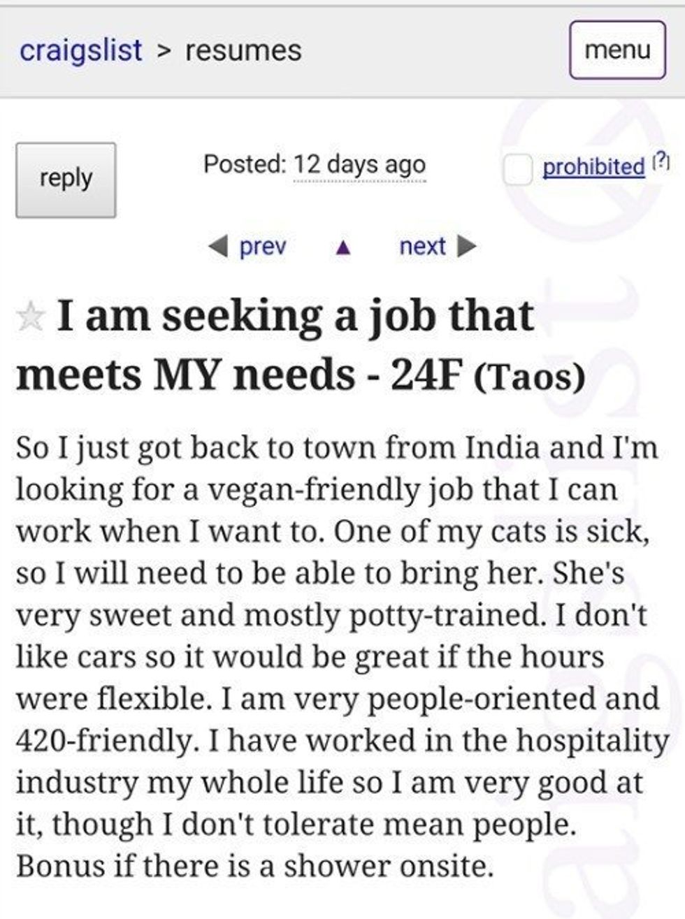 Cue every employee in the hospitality industry trying to figure out just how this 24-year-old female from Taos plans on avoiding mean people. There are a few demands on this list that are confusing, a few that are insulting, and a few that are downright delusional.