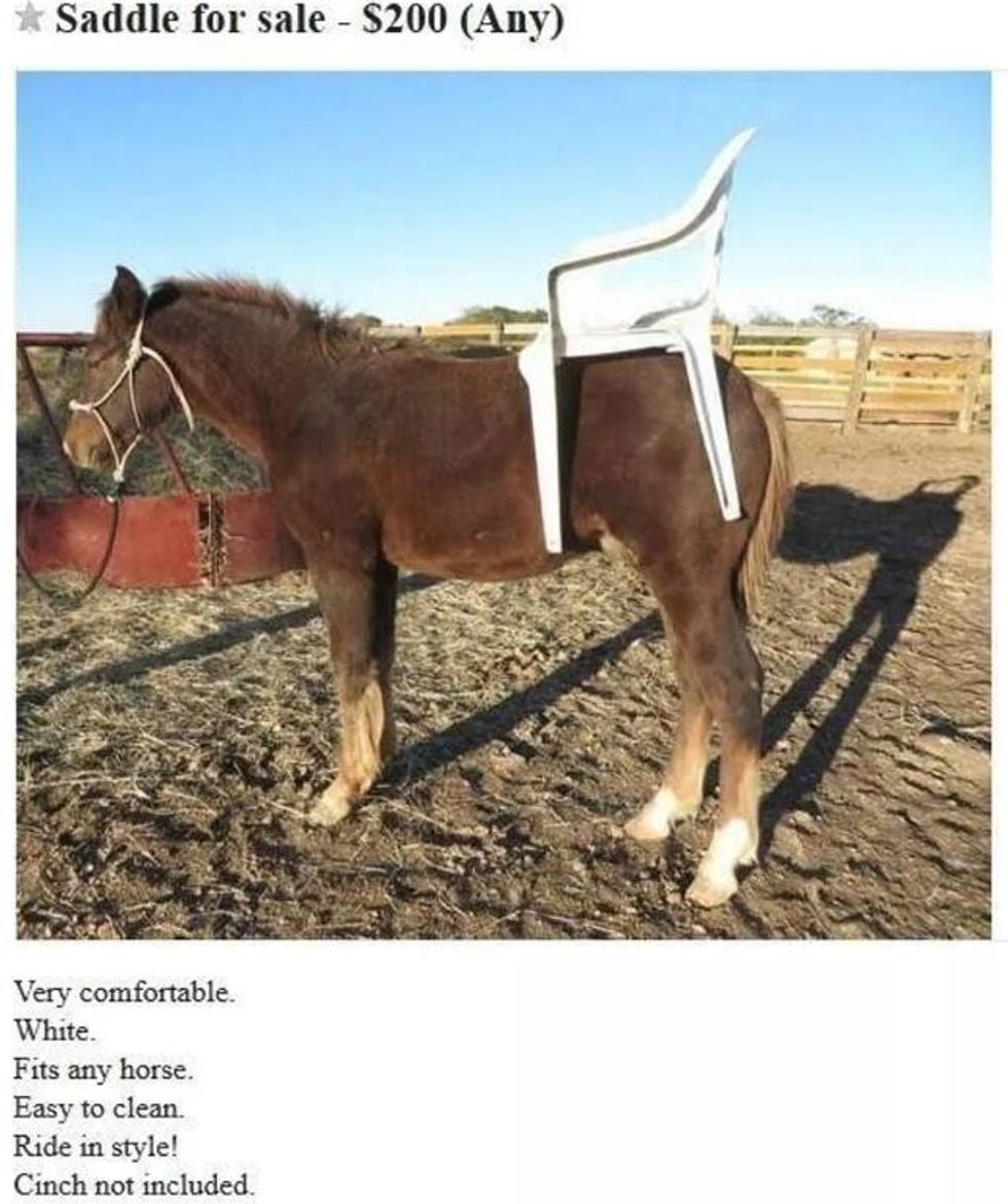 Looking past the potential for animal cruelty in this photo, one does wonder just how effective a plastic chair would be as a saddle. Probably incredibly ineffective, what with the inability to wrap your legs around the horse.
