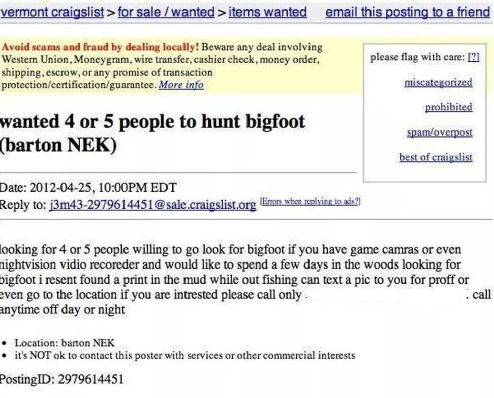 Forget Bigfoot. Someone needs to take this Barton, VT, resident on a quest for some punctuation. Besides the run-on sentence that’s plagued by typos, this doesn’t quite seem like someone you'd want to spend a few days in the woods with.