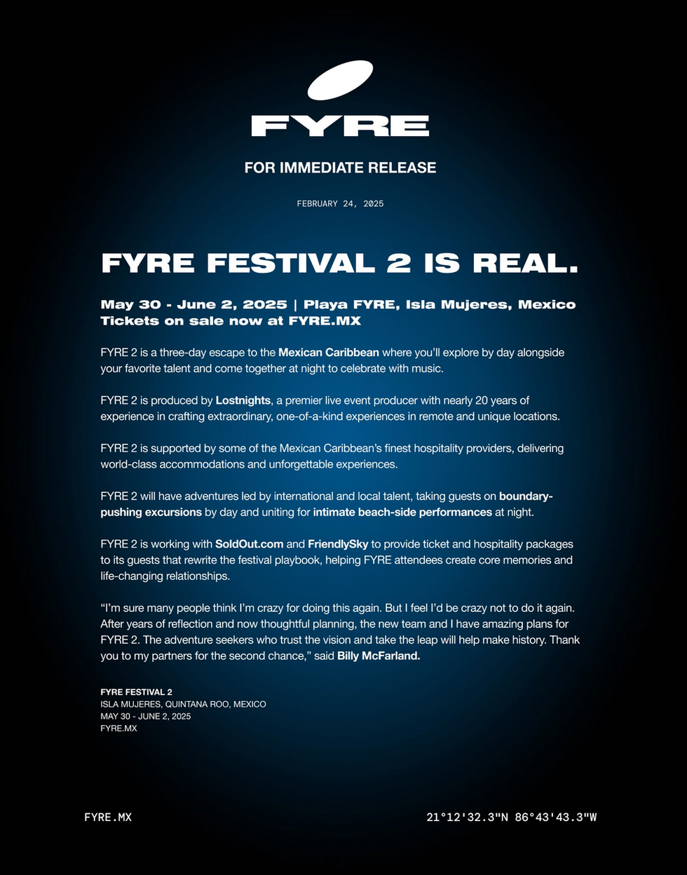 But now he's already gearing up for another shot with Fyre 2.0, a "three-day escape to the Mexican Caribbean."
