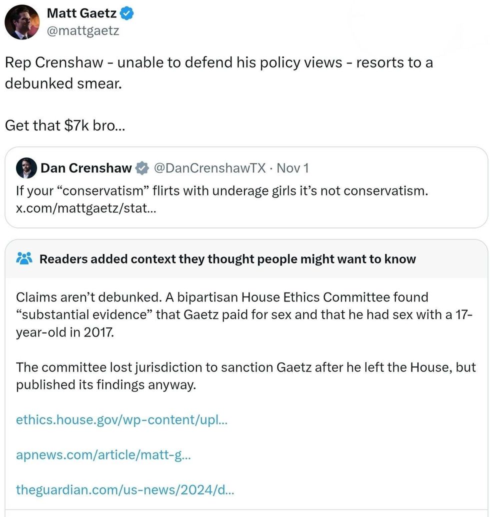 But X users stepped in with a context community note for Gaetz, debunking his own false claim. Gaetz was never cleared—he was just never charged, unlike some of his associates, and resigned from Congress before he could be sanctioned.