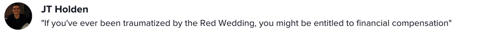 \u201cThe Red Wedding will leave you with trust issues and have you in therapy for years.\u201d— G\u029c\u1d00\u0274\u1d00\u026a\u1d00\u0274 J\u1d0f\u029f\u029f\u1d0f\u0493\u1d0f\u0262\u026as\u1d1b\ud83c\uddec\ud83c\udded (@G\u029c\u1d00\u0274\u1d00\u026a\u1d00\u0274 J\u1d0f\u029f\u029f\u1d0f\u0493\u1d0f\u0262\u026as\u1d1b\ud83c\uddec\ud83c\udded) 1677155087