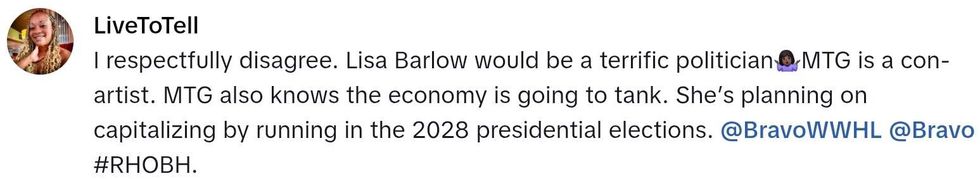 "I do love Heather. Uh, I think [The Real Housewives of Salt Lake City's] Heather Gay would actually make a great politician. I think she knows how to maneuver, get along with everybody. She's funny. She's a storyteller. I'm a fan."