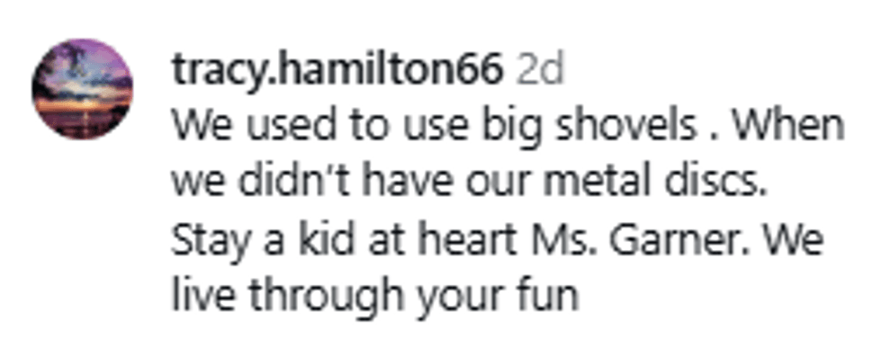 She then demonstrated by sitting down on the baking sheet at the top of the hill and starting a surprisingly quick descent. The women around her were cheering, and then she spun out, ending up with her legs straight up in the air, the baking sheet coming out from under her, and Garner issuing her iconic laugh.