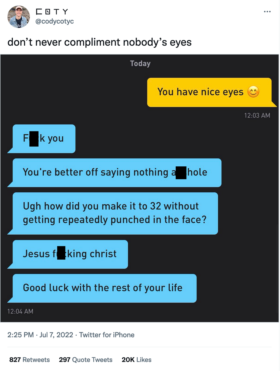 Did their profile say don’t compliment my eyes or somethin? Or this is someone you’ve talked to and pissed off before? There’s no way this reaction is just from that. Although it’s grindr so…