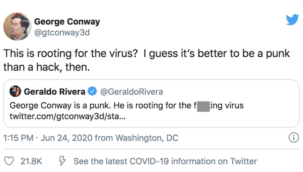 Conway—a founder of the anti-Trump Republican PAC The Lincoln Project—proved that again today when he and conservative leaning radio host Geraldo Rivera exchanged barbs on Twitter.