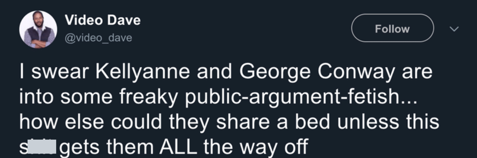 As if the lengths Conway goes to distort the truth aren't bizarre enough, speculation on the relationship between her and her Republican lawyer husband George Conway takes the cake. George, though a Republican, is vocally anti-Trump—even starting a PAC with fellow Never Trump Republicans called The Lincoln Project, which recently released a brutal Trump attack ad called Mourning in America.