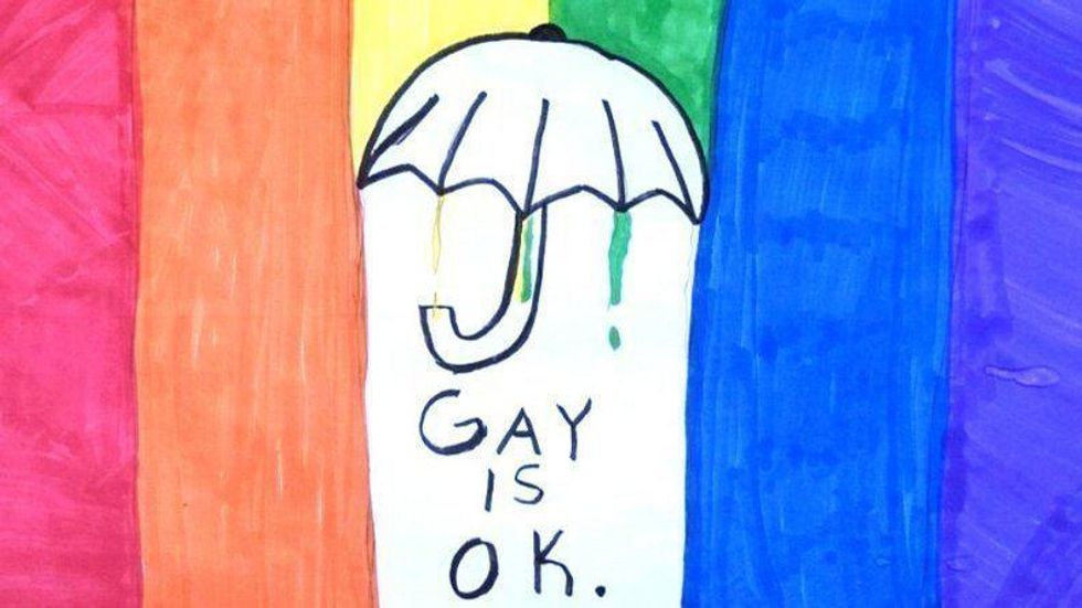 Earlier that month, the student created a piece of artwork with the same message, "Gay is ok!" The artwork was removed from a classroom display by administrators who allegedly compared it to "Nazi symbolism."