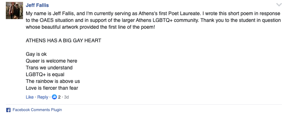 Athens Poet Laureate Jeff Fallis even penned a poem in support, pictured here in a comment to Athen's alt-weekly magazine, Flagpole.