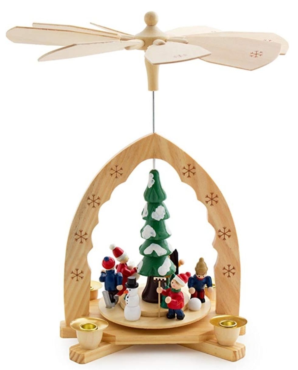 Another popular German tradition are the carved wooden Weihnachtspyramide or referred to as Christmas pyramids in English. Once candles are lit, the scenes turn.