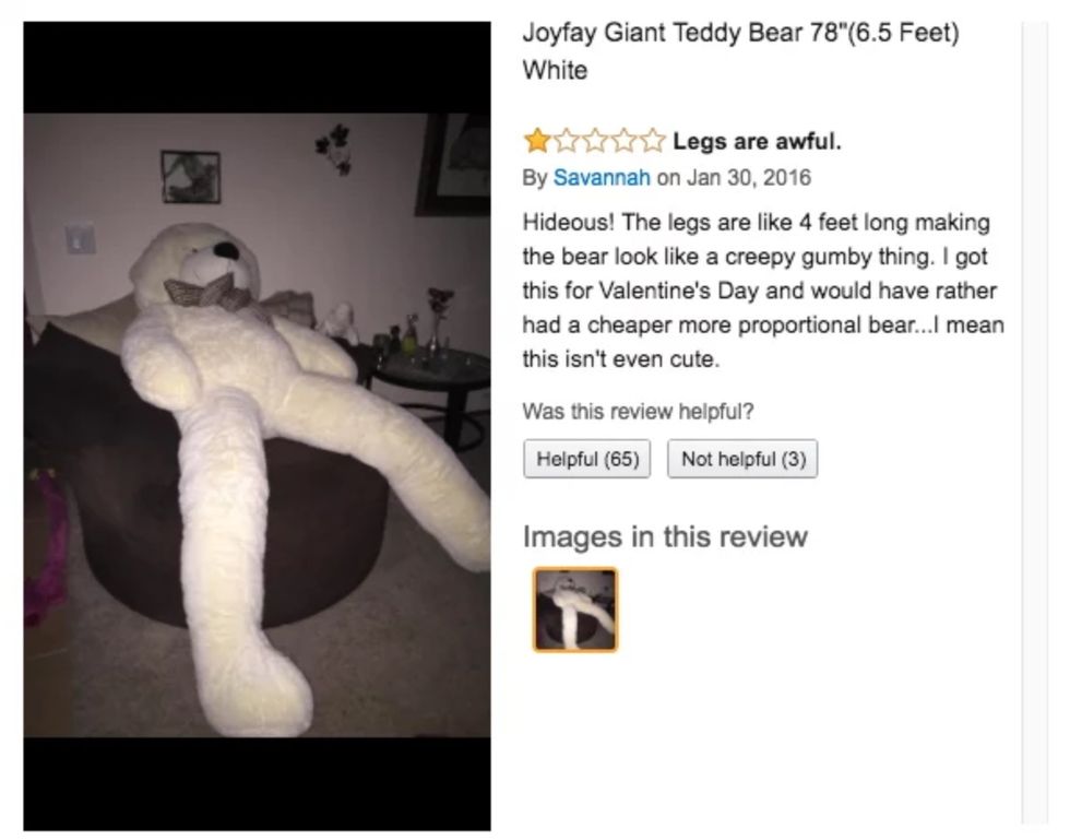 One concerned citizen questions the safety and sincerity of such a large Valentine gift: "Why are the legs so long? Is your valentine planning to stalk you in it after he gets dumped? Serial teddy bear killer"