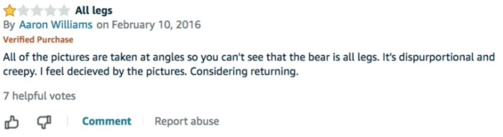 Bu then you pause for a moment, and scroll down to read the reviews. That is when you discover that the exact proportions of this seemingly cute and cuddly, stuffed and fluffy white teddy bear are a bit off...