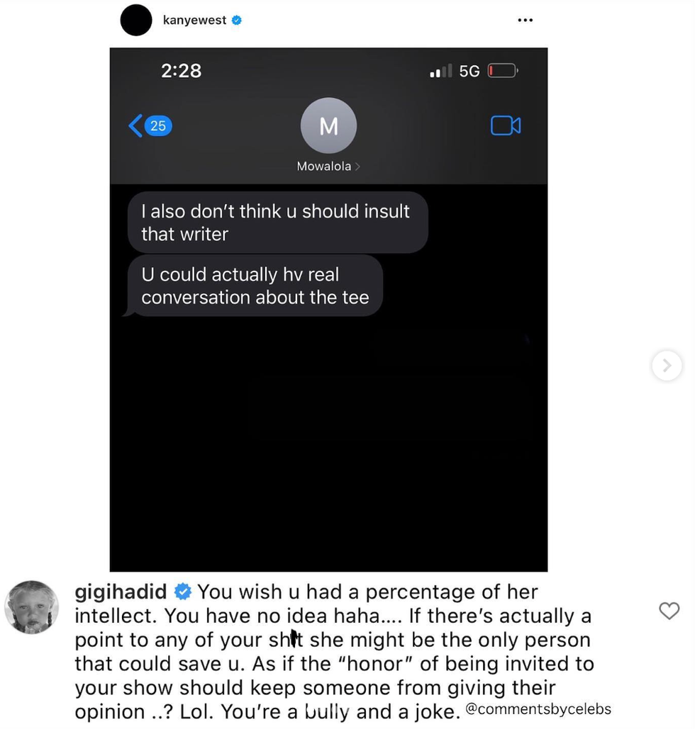 Model Gigi Hadid defended Karefa-Johnson by commenting on Ye's post.